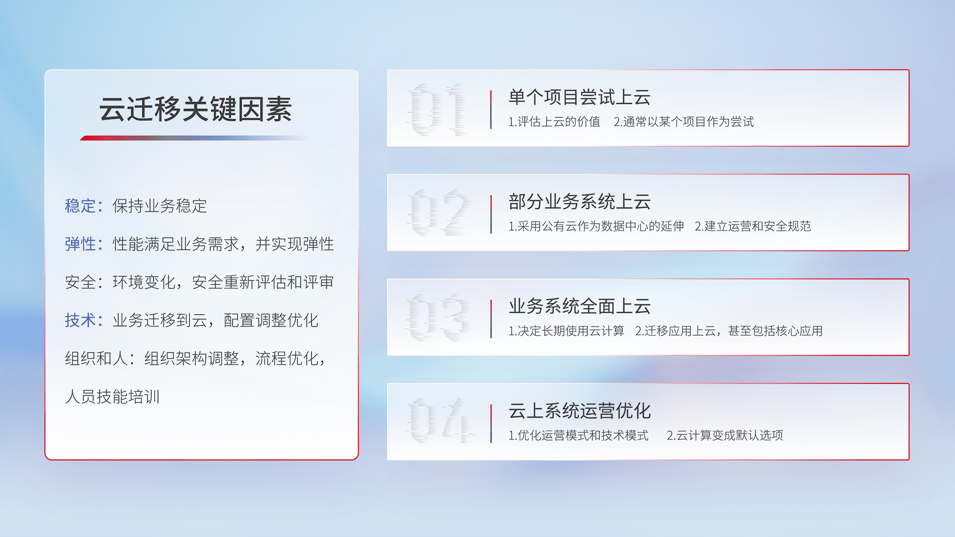 结合实际业务,,,从规划设计、、、云平台选型、、、、云原生改造、、、数据迁移、、集成交付,,,迁移全过程为客户识别最佳上云路径,,,,做好风险识别管理,,,设计网络架构、、、、身份权限、、、、安全审计合规、、、操作审计、、、、日志审计、、、、监控告警策略、、、、多站点容灾设计等,,,对云上基础设施进行整体规划,,,,提升IT治理水平,,以满足弹性、、高可用、、高性能的需求。。。