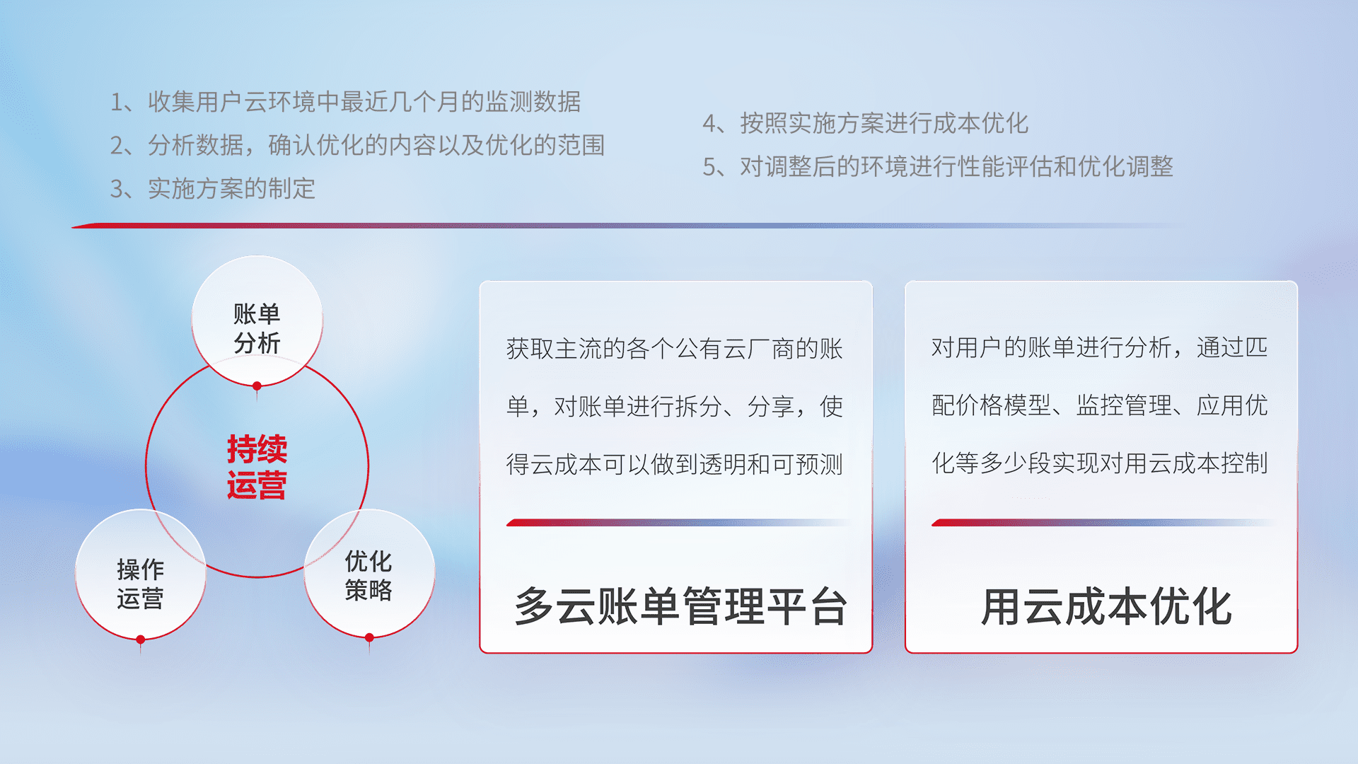 通过多云纳管,,以统一的资源数据模型把客户的云资源进行抽象和封装,,,进而实现对多云资源的统一操作,,,保障云资源管理的可靠性、、、稳定性与可用性。。。量身定制化运维内容,,,,配置、、、、开发运维、、补丁管理、、、备份、、、监控、、、认证和访问管理、、、、审计和日常巡检等,,保障在用云过程中的可靠度,,稳定度以及高可用率。。。。